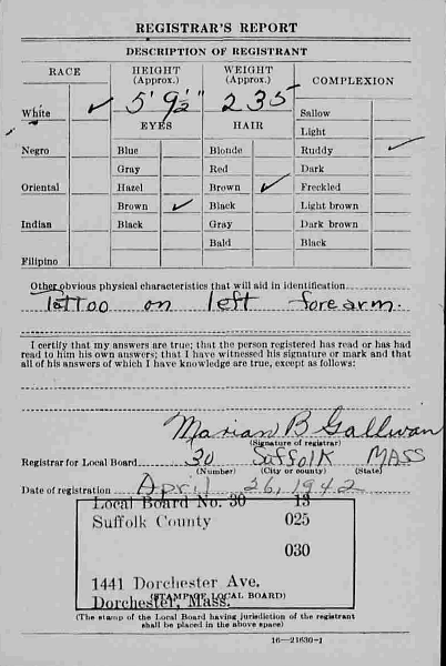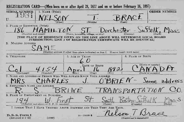 | Milit-Draft | He was drafted into the U.S. military on 26 April 1942 in 1441 Dorchester Ave., Dorchester, Suffolk County, Massachusetts, USAG, he was described as 5' 9.5" tall, brown eyes (grey in the WW I draft card), brown hair, ruddy complexion and weighed 235 lbs (he was also 60 years old.)11 Front of World War II draft card, Nelson Talmage Brace  Back of World War II draft card, Nelson Talmage Brace |