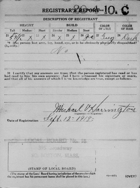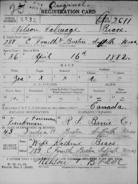 | Milit-Draft | He was drafted into the U.S. military on 12 September 1918 in South Boston, Suffolk County, Massachusetts, USAG, on his draft card Nelson was described as 5' 9.5" tall, stout, grey eyes and dark hair.1 Front of World War I draft card, Nelson Talmage Brace  Back of World War I draft card, Nelson Talmage Brace |
