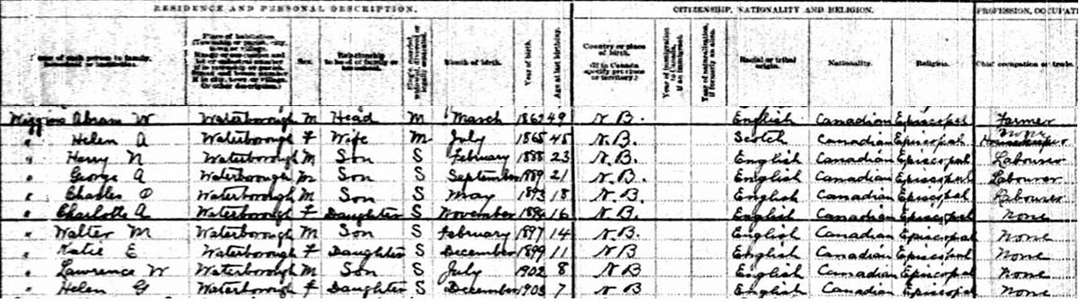 | Census | He was head of the household in the census in 1911 in Waterborough, Queens County, New Brunswick, CanadaG. included in the household were Abram's wife Helen, and children Harry (age 23), George (age 21), Charles (age 18), Charlotte (age 16), Walter (age 14), Katie (age 11), Lawrence (age 8) and Helen (age 7). Abram was a farmer. Sons Harry, George and Charles were labourers. The family religion was Episcopal.2 1911 Canada Census, Waterborough, Queens County, New Brunswick. Household of Abraham Wood Wiggins, his wife Helen (Tower), and their children Harry, George, Charles, Charlotte, Walter, Katie, Lawrence and Helen. |