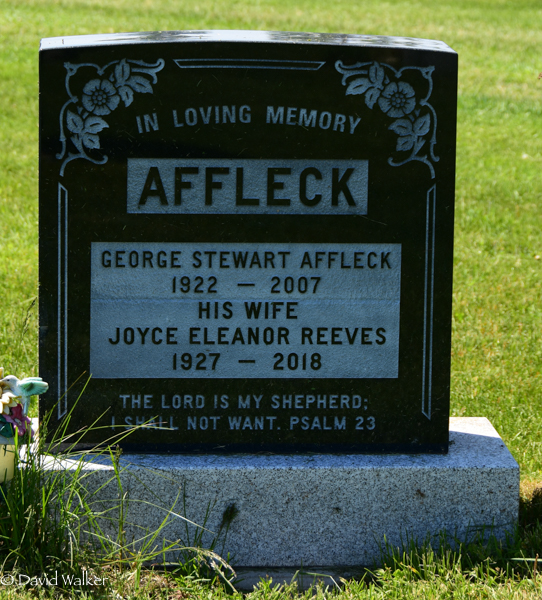 | Principal 2 | She witnessed the burial of George Stewart Affleck and Eleanor Joyce Reeves in Bedeque Cemetery, Lower Bedeque, Prince County, Prince Edward Island, Canada, 46.34725, -63.73422G.2,3![]() Cemetery marker, George Stewart Affleck (1922-2007), his wife Joyce Eleanor Reeves (1927-2018). Bedeque Cemetery, Lower Bedeque, Prince County, Prince Edward Island, Canada. |