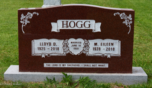 | Burial | He was buried in North Bedeque Cemetery, North Bedeque, Prince County, Prince Edward Island, Canada, 46.36225, -63.72518G. Inscription: HOGG / Lloyd D. / 1925 - 2018 / Married / June 14, 1950 / M. Eileen / 1928 - 2018 // The Lord is My Shepherd; I Shall Not Want.6,7 ![]() Tombstone, Lloyd D. Hogg (1925-2018), his wife Myrtle Eileen Waugh (1928-2018). Presbyterian/United Cemetery, North Bedeque, Prince County, Prince Edward Island, Canada. |