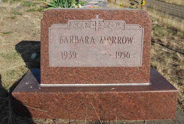 Inscription: Barbara Morrow / 1939 - 1956.2  Cemetery marker - Barbara Adele Morrow (1939-1956). Long Creek Cemetery, Long Creek, Grant County, Oregon, U.S.A. Photo courtesy of findagrave.com.
