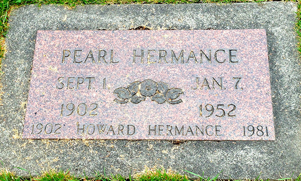 Inscription Front: Pearl Hermance / Sept. 1 / 1902 | Jan. 7 / 1952 // 1902 Howard Hermance 1981.7  Marker, Pearl Schurman (1902-1952), her husband Howard Hermance (1902-1981). Crescent Grove Cemetery, Tigard, Washington County, Oregon, U.S.A. Photo courtesy of findagrave.com.