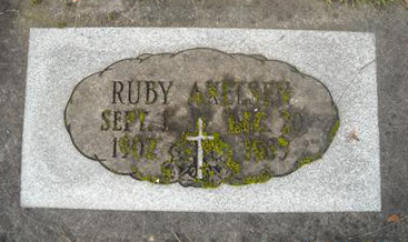 Inscription Front: Ruby Axelsen / Sept. 1 / 1902 | Dec. 20 / 1983.9  Marker, Ruby Schurman (1902-1983). Crescent Grove Cemetery, Tigard, Washington County, Oregon, U.S.A. Photo courtesy of findagrave.com.