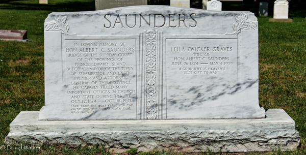 Inscription: SAUNDERS / In Loving Memory of / Hon. Albert C. Saunders / Judge of the Supreme Court / of the Province of / Prince Edward Island. / A Former Mayor of the Town / of Summerside and Later / Premier and Attorney / General of this Province./ He Capably Filled Many / Important Offices in Church / and State During His Life. / Oct. 12, 1874 - Oct. 18, 1943 / "Then shall the dust return to the / earth and the Spirit unto God / who gave it."1  Tombstone, Hon. Albert C. Saunders (1874-1943), his wife Leila Zwicker Graves (1874-1959). St. John's Anglican Cemetery, St. Eleanors , Prince County, Prince Edward Island, Canada.