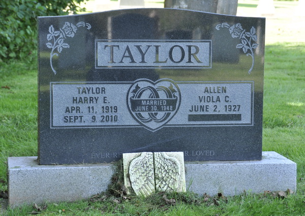 TAYLOR / Taylor / Harry E. / Apr. 11, 1919 / Sept. 9, 2010 | Married / June 30, 1948 | Allen / Viola C. / June 2, 1927 / Ever Remembered, Ever Loved.1  Tombstone, Harry E. Taylor (1919-2010), his wife Viola C. Allen (1927- ). Peoples Cemetery, Malpeque, Prince County, Prince Edward Island, Canada.