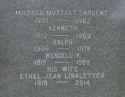 Inscription: MUTTART / Hillard Graydon Muttart / 1881 - 1944 / His Wife / Helen Steves McEwen / 1889 - 1958Back: Mildred Muttart Sargent / 1907 - 1962 / Kenneth / 1910 - 1969 / Ralph / 1906 - 1978 / Wendell / 1919 - 1989 / His Wife / Ethel Jean Linkletter / 1919 - 2014Footstones: Mother, Father.2,3  Tombstone, Hillard Graydon Muttart (1881-1944), his wife Helen Steeves McEwen (1889-1958), their children Mildred Muttart Sargent (1907-1962), Kenneth (1910-1969), Ralph (1906-1978) and Wendell (1919-1989), and his wife Ethel Jean Linkletter (1919-2014). People's Cemetery, Summerside, Prince County, Prince Edward Island, Canada.  Back inscription detail.
