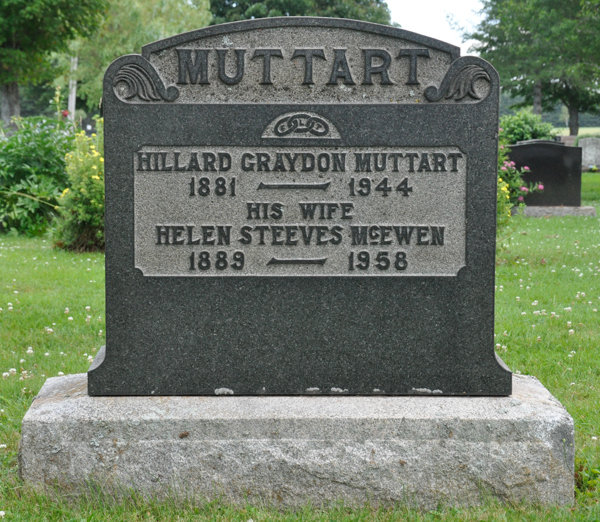 Inscription: MUTTART / Hillard Graydon Muttart / 1881 - 1944 / His Wife / Helen Steves McEwen / 1889 - 1958Back: Mildred Muttart Sargent / 1907 - 1962 / Kenneth / 1910 - 1969 / Ralph / 1906 - 1978 / Wendell / 1919 - 1989 / His Wife / Ethel Jean Linkletter / 1919 - 2014Footstones: Mother, Father.3  Tombstone, Hillard Graydon Muttart (1881-1944), his wife Helen Steeves McEwen (1889-1958), their children Mildred Muttart Sargent (1907-1962), Kenneth (1910-1969), Ralph (1906-1978) and Wendell (1919-1989), and his wife Ethel Jean Linkletter (1919-2014). People's Cemetery, Summerside, Prince County, Prince Edward Island, Canada.  Back inscription detail.
