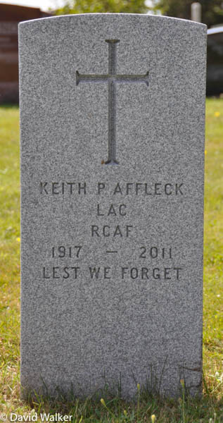 Military marker. Inscription: Keith P. Affleck / LAC / RCAF / 1917 - 2011 / Lest We Forget.2,3  Tombstone, Keith P. Affleck (1917-2011). Church of Scotland Cemetery, Cape Traverse, Prince County, Prince Edward Island, Canada.