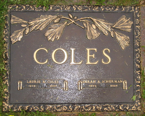 Inscription: COLES / Laurie A. Coles / 1928 - 2007 | Sarah A. Schurman / 1929 - 2009.1,2  Tombstone, Laurie A. Coles (1928-2007), his wife Sarah A. Schurman (1929-2009). Floral Hills Memorial Gardens, Pleasant Valley, Queens County, Prince Edward Island, Canada.