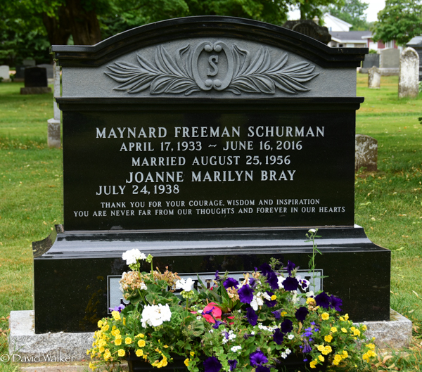 Inscription: Maynard Freeman Schurman / April 17, 1933 - June 16, 2016 / Married August 25, 1956 / Joanne Marilyn Bray / July 24, 1938 - / SCHURMAN.1,2  Tombstone, Maynard Freeman Schurman (1933-2016), his wife Joanne Marilyn Bray (1938- ). Peoples Cemetery, Summerside, Prince County, Prince Edward Island, Canada.