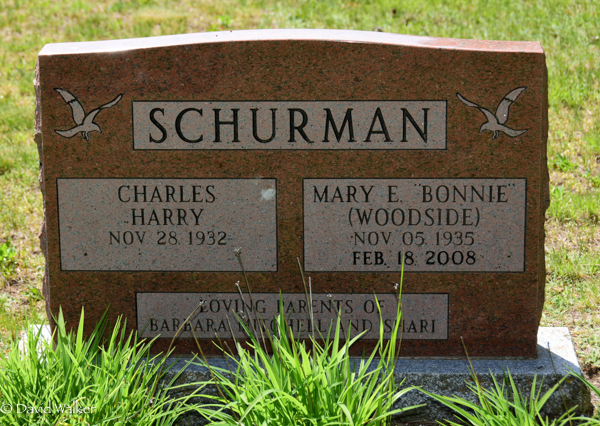 Inscription: SCHURMAN / Charles / Harry / Nov. 28, 1932 | Mary E. "Bonnie" / (Woodside) / Nov. 05, 1935 / Feb. 18, 2008 // Loving Parents of / Barbara, Mitchell and Shari.3,2  Cemetery marker, Charles Harry Schurman (1932- ), his wife Mary Elizabeth Woodside (1935-2008). United Church Cemetery, Searletown, Prince County, Prince Edward Island, Canada.