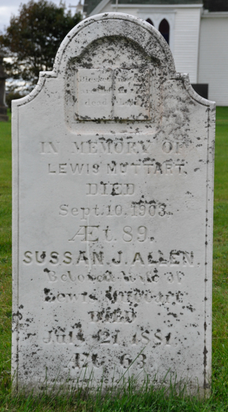 Inscription: In Memory of / Lewis Muttart / Died / Sept. 10, 1903, / Æt. 89 / Sussan J. Allen, / July 21, 1881, / Æt. 63.2  Tombstone, Lewis Muttart (1814-1903y), his wife Susan J. Allen (1818-1881). United Church Cemetery, Cape Traverse, Prince County, Prince Edward Island, Canada.