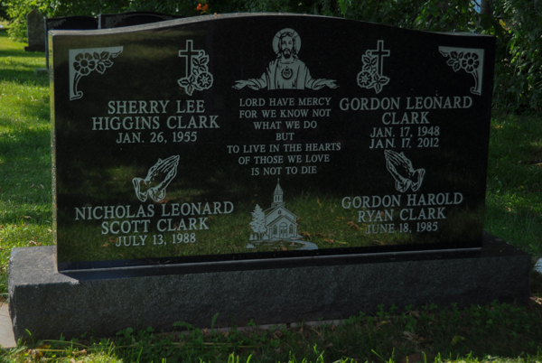 Stone 71e. Inscription: Sherry Lee / Higgins Clark / Jan. 26, 1955 / Nicholas Leonard / Scott Clark / July 13, 1988 | Lord have mercy / For we know not / what we do / but / to live in the hearts / of those we love / is not to die | Gordon Leonard / Clark / Jan. 17, 1948 - / Jan. 17, 2012 / Gordon Harold / Ryan Clark / June 18, 1985 Back: CLARK.1,3  Tombstone, Gordon Leonard Clark (1948-2012). United/Baptist Cemetery, Central Bedeque, Prince County, Prince Edward Island, Canada.
