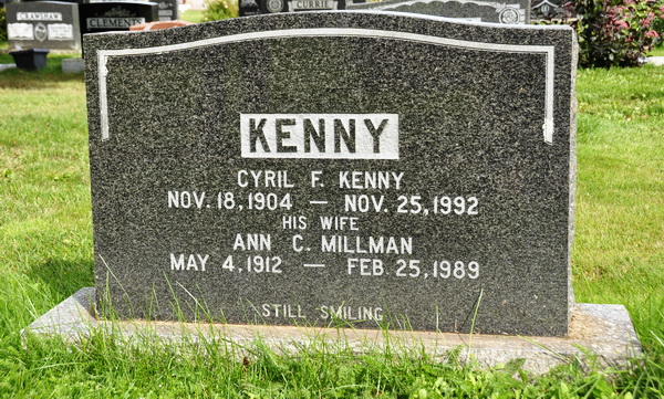 | Burial | She was buried in the Peoples Cemetery, Summerside, Prince County, Prince Edward Island, Canada, 46.40518, -63.77545G. Inscription: KENNY / Cyril F. Kenny / Nov. 18, 1904 - Nov. 25, 1992 / His Wife / Ann C. Millman / May 4, 1912 - Feb. 25, 1989 / Still Smiling.Back: KENNY.2,1 Tombstone, Cyril Franklin Kenny (1904-1992) & Anna Catherine Millman (1912-1989). Peoples Cemetery, Summerside, Prince County, Prince Edward Island, Canada. |