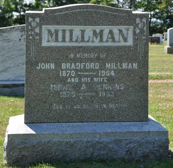 - [S7588] Cemetery Marker. John Bradford Millman & Minnie A. Jenkins, inscription; read by David A. Walker, 30 July 2012.