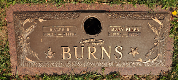 Inscription Front: Ralph R. / 1911 - 1978 | Mary Ellen / 1910 - 1996 // BURNS.4  Tombstone, Ralph Burns (1911-1978), his wife Mary Ellen Heffell (1910-1996). Floral Hills Memorial Gardens, Pleasant Valley, Queens County, Prince Edward Island, Canada.