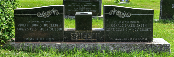 Inscription: In Loving Memory / Vivian Doris Burleigh / Aug. 25, 1915 - July 31, 2010 | SHEEN | In Loving Memory / Gerald Baker Sheen / Sept. 22, 1913 - Nov. 28, 1972.1,2  Tombstone, Gerald Baker Sheen (1913-1972), his wife Vivian Doris Burleigh (1915-2010). Peoples Cemetery, Summerside, Prince County, Prince Edward Island, Canada.