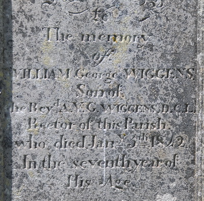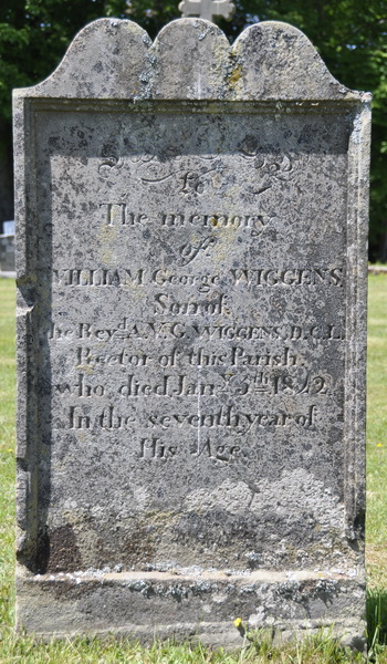 | Burial | He was buried on 7 January 1842 in St. John's Anglican Church Cemetery, St. Eleanors, Prince County, Prince Edward Island, 46.42006, -63.81020G. his stone is very much weathered.Inscription: In Memory of / William George Wiggens / Son of / Rev. A.V.G. Wiggens / Rector of This Parish / who Died Jan 5 1842 / In the seventh year of / His Age.2![]() Tombstone, William George Wiggins (1834-1842). St. John's Anglican Church Cemetery, St. Eleanors, Prince County, Prince Edward Island, Canada. ![]() Front inscription detail. |