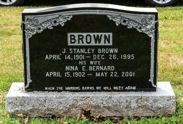 Inscription: BROWN / J. Stanley Brown / April 14, 1901 - Dec. 26, 1995 / His Wife / Nina E. Bernard / April 12, 1902 - May 22, 2001 / When the Morning Dawns We Shall Meet Again.2,1  Tombstone, J. Stanley Brown (1901-1995), his wife Nina E. Bernard (1902-2001). Peoples Cemetery, New London, Queens County, Prince Edward Island, Canada.
