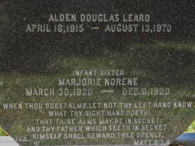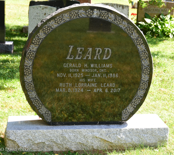 Inscription: LEARD / Gerald H. Williams / Born Windsor, Ont. / Nov. 11, 1925 - Jan. 11, 1986 / His Wife / Ruth Lorraine Leard / Mar. 8, 1924 - Apr. 6, 2017Back: Alden Douglas Leard / April 16, 1915 - August 13, 1970 / Infant Sister / Marjorie Norene / March 30, 1920 - Dec. 6, 1920.1,2  Tombstone, Gerald H. Williams (1925-1986), his wife Ruth Lorraine Leard (1924-2017), her siblings Alden Douglas Leard (1915-1970) and Marjorie Norene Leard (1920-1920). United-Baptist Cemetery, Central Bedeque, Prince County, Prince Edward Island, Canada.  Back inscription detail.