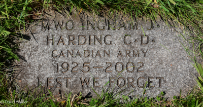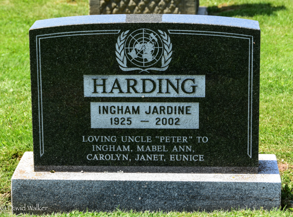 Inscription: HARDING / Ingham Jardine / 1925 - 2002 / Loving Uncle "Peter" to / Ingham, Mabel Ann, / Carolyn, Janet, EuniceMilitary Flatstone: MWO Ingham J. Harding C.D. / Canadian Army / 1925 - 2002 / Lest We Forget.1,2  Tombstone, Ingham Jardine Harding (1925-2002). United Church Cemetery, Summerfield, Queens County, Prince Edward Island, Canada.  Military flatstone marker.