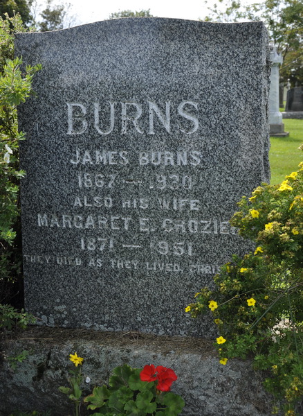 | Burial | He was buried in the Peoples Cemetery, Malpeque, Prince County, Prince Edward Island, Canada, 46.52993, -63.68706G. Inscription: BURNS / James Burns / 1867 - 1930 / Also His Wife / Margaret E. Crozier / 1871 - 1951 / They died as they lived, Christians.1 Tombstone, James Burns (1867-1930), his wife Margaret E. Crozier (1871-1951). Peoples Cemetery, Malpeque, Prince County, Prince Edward Island, Canada. |