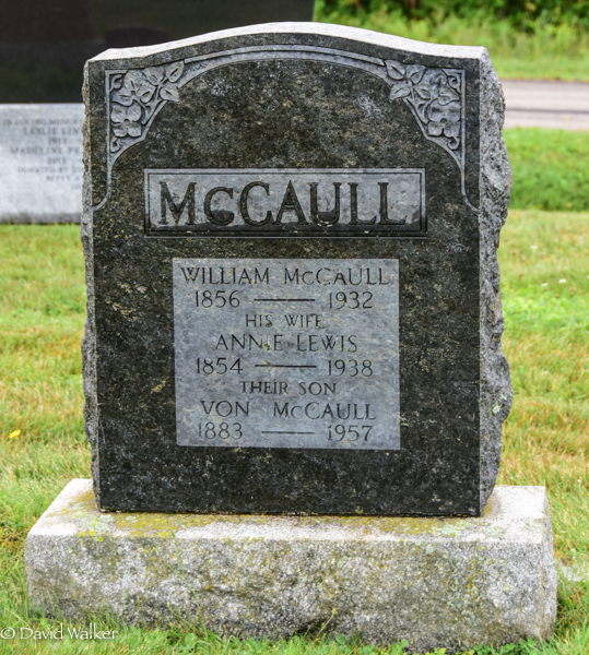 Inscription: McCAULL / William McCaull / 1856 - 1932 / His Wife / Annie Lewis / 1854 - 1938 / Their Son / Von McCaull / 1883 - 1957.1  Tombstone, William McCaull (1856-1932), his wife Annie Lewis (1854-1938), their son Von McCaull (1883-1957). Peoples Cemetery, Freetown, Prince County, Prince Edward Island, Canada.