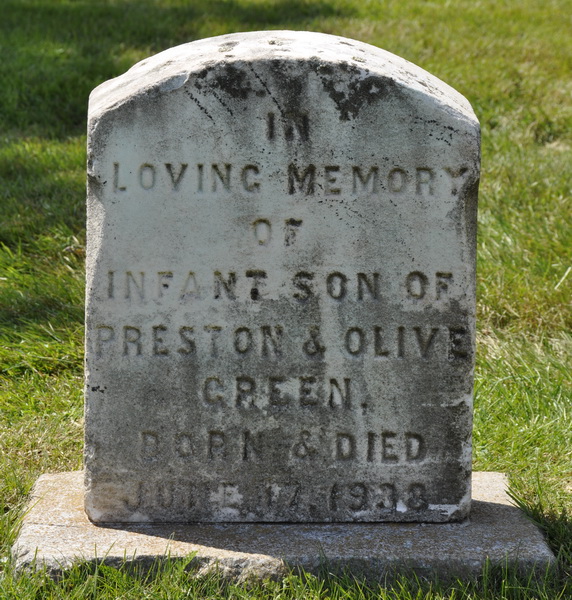 | Burial | He was buried in the Peoples Cemetery, Malpeque, Prince County, Prince Edward Island, Canada, 46.52982, -63.68785G. In / Loving Memory / of / Infant Son of / Preston & Olive / Green / Born & Died / June 17, 1938.1 Tombstone, Infant Son Green (1938-1938). Peoples Cemetery, Malpeque, Prince County, Prince Edward Island, Canada. |