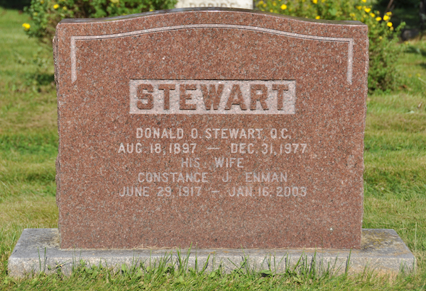 | Interred | She was buried in the plot of Donald Ormsby Stewart, in the Peoples Cemetery, Summerside, Prince County, Prince Edward Island, Canada, 46.40468, -63.77556G. Inscription: STEWART / Donald O. Stewart, Q.C. / Aug. 18, 1897 - Dec. 31, 1977 / His Wife / Constance J. Enman / June 29, 1917 - Jan 16, 2003.1 ![]() Tombstone, Donald O. Stewart (1897-1977), his wife Constance J. Enman (1917-2003). Peoples Cemetery, Summerside, Prince County, Prince Edward Island, Canada. |