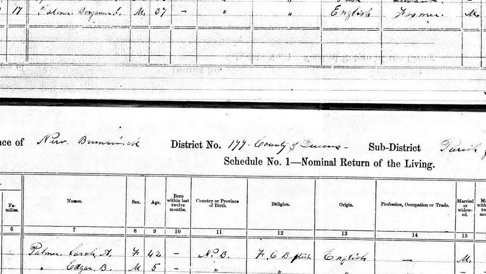 | Census | He was head of the household in the census in 1871 in Parish of Hampstead, Queens County, New Brunswick, CanadaG. included in the household with Daniel (age 33) was his wife Sarah Carpenter (age 24). Daniel was a farmer. The family religion was Free Christian Baptist.5![]() 1871 Canada Census, Parish of Hampstead, Queens County, New Brunswick. Household of Daniel Palmer, his wife Sarah Carpenter. |