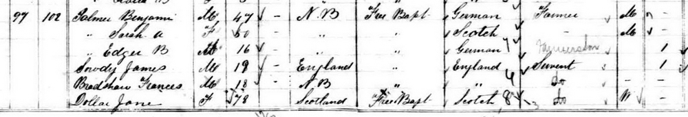 | Son | He was enumerated on the census in 1861 in the household of Stephen Palmer, as a son, in Hampstead, Queens County, New Brunswick, CanadaG. included in the household with Stephen (age 57) were his wife Phebe Coy (age 48), their children Emma (age 25), Daniel (age 23), Albert (age 20), Frances (age 13), Phebe (age 10) and Alice (age 7). Stephen's occupation was listed as farmer. The family religion was Free Baptist.1![]() 1861 Census, Hampstead, New Brunswick. Household of Stephen Palmer. Included in the household were his wife Phebe (Coy), Emma, Daniel, Albert, Frances, Phebe and Alice. Stephen's occupation was listed as farmer. The family religion was Free Baptist. |