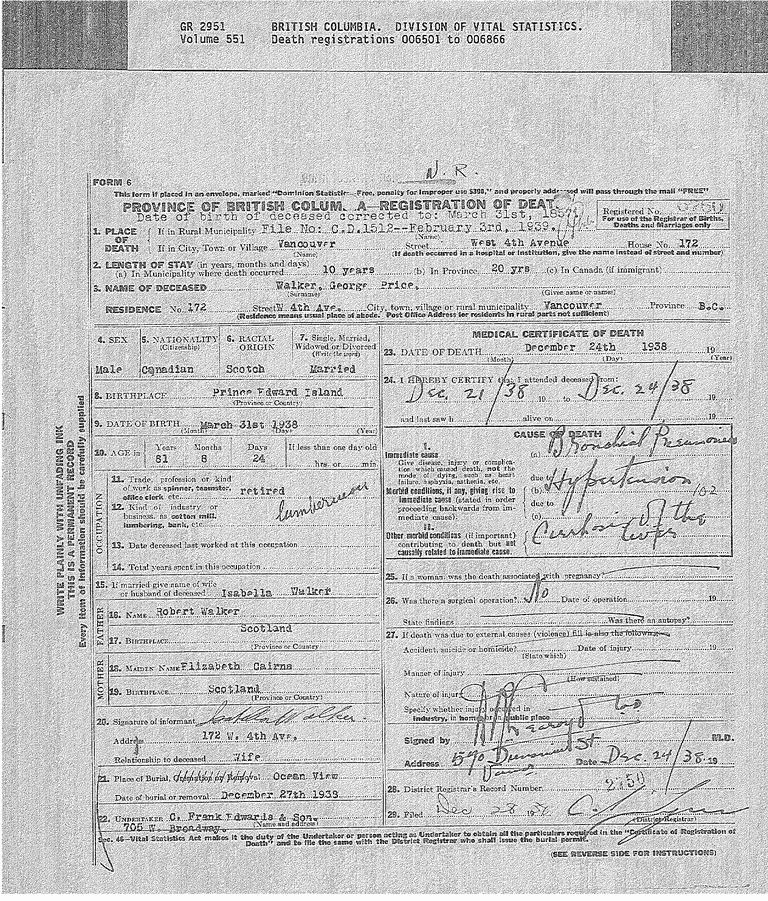 | Death | He died on 24 December 1938, at home, 172 W. 4th Ave., Vancouver, British Columbia, CanadaG; His death certificate shows that the physician tended to him from 21 to 24 December, and that he died of bronchial pneumonia, due to hypertension and cirrhosis of the liver. The informant for his death certificate was Isabella Walker, his wife. Obituary: "Death - George Walker, in Vancouver B.C. Dec. 28 1938, age 82, formerly of New Annan, leaving a widow, son & daughter." (The Maple Leaf, Oakland, California, January 1939, p. 14.).Obituary: Summerside Journal, "Many Island friends will learn with regret of the death of George Walker who passed away in Vancouver, B.C., on Dec. 28th. Mr. Walker was 82 years of age and the last member of the family of the late Robert Walker of New Annan. Mr. Walker was born in New Annan, but had lived in Vancouver for many years. His last visit to the Island was nine years ago when he married Miss Bell Walker of Cape Traverse. Besides his widow he leaves to mourn one son, Arthur Walker, of Moncton, N.B., and one daughter, Mrs. Lamb, of Vancouver, B.C., children of his first wife. Mr. Walker was most highly esteemed both in his native province and the home of his adoption. Interment was at Vancouver on December 30th". His death certificate shows that the physician tended to him from 21 to 24 December, and that he died of bronchial pneumonia, due to hypertension and cirrhosis of the liver. The informant for his death certificate was Isabella Walker, his wife. Obituary: "Death - George Walker, in Vancouver B.C. Dec. 28 1938, age 82, formerly of New Annan, leaving a widow, son & daughter." (The Maple Leaf, Oakland, California, January 1939, p. 14.).Obituary: Summerside Journal, "Many Island friends will learn with regret of the death of George Walker who passed away in Vancouver, B.C., on Dec. 28th. Mr. Walker was 82 years of age and the last member of the family of the late Robert Walker of New Annan. Mr. Walker was born in New Annan, but had lived in Vancouver for many years. His last visit to the Island was nine years ago when he married Miss Bell Walker of Cape Traverse. Besides his widow he leaves to mourn one son, Arthur Walker, of Moncton, N.B., and one daughter, Mrs. Lamb, of Vancouver, B.C., children of his first wife. Mr. Walker was most highly esteemed both in his native province and the home of his adoption. Interment was at Vancouver on December 30th".23,24,25,26,27,28 ![]() Death certificate for George Price Walker. |