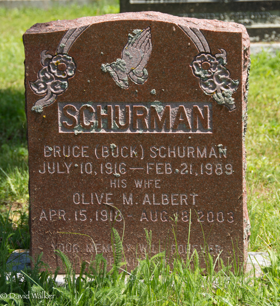 Inscription: SCHURMAN / Bruce (Buck) Schurman / July 10, 1915 - Feb. 21, 1989 / His Wife / Olive M. Albert / Apr. 15, 1918 - Aug. 18, 2003.2,1  Tombstone, Bruce Schurman (1917-1989), his wife Olive Albert (1918-2003). Peoples Cemetery, Summerside, Prince County, Prince Edward Island, Canada.