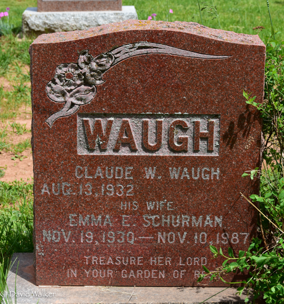 Inscription: WAUGH / Claude W. Waugh / Aug. 13, 1932 - / His Wife / Emma E. Schurman / Nov. 19, 1930 - Nov. 10, 1987 / Treasure Her Lord / In Your Garden of Rest.1,2  Cemetery marker, Claude W. Waugh (1932- ), his wife Emma E. Schurman (1930-1987). Peoples Cemetery, Summerside, Prince County, Prince Edward Island, Canada.