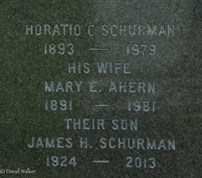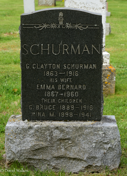 Inscription: SCHURMAN / G. Clayton Schurman / 1863 - 1916 / His Wife / Emma Bernard / 1867 - 1960 / Their Children / G. Bruce 1889 - 1916 / Nina M. 1898 - 1941Back:Horatio C. Schurman / 1893 - 1979 / His Wife / Mary E. Ahern / 1891 - 1981 / Their Son / James H. Schurman / 1924 - 2013 [Mary Ahearn is actually buried in St. Paul's Catholic Cemetery in Summerside].3,4  Cemetery marker, George Clayton Schurman (1863-1917), his wife Emma Bernard (1867-1960), their children Bruce (1889-1916), Nina (1898-1941), Horatio (1893-1979), his wife Mary Ahearn (1891-1981), their son James (1924-2013). Peoples Cemetery, Summerside, Prince County, Prince Edward Island, Canada.  Back inscription detail.