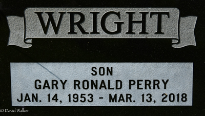 Inscription: WRIGHT / Georgina M. / Schurman / 1925 - 2010 / Wife | John A. Wright / 1917 - 1992 / Husband / Ever Remembered, Ever LovedBack: WRIGHT / Son / Gary Ronald Perry / Jan. 14, 1953 - Mar. 13, 2018.1  Cemetery marker, John A. Wright (1917-1992), his wife Georgina M. Schurman (1925-2010). Her son by first marriage, Gary Ronald Perry (1953-2018). Peoples Cemetery, Summerside, Prince County, Prince Edward Island, Canada.  Back inscription detail.