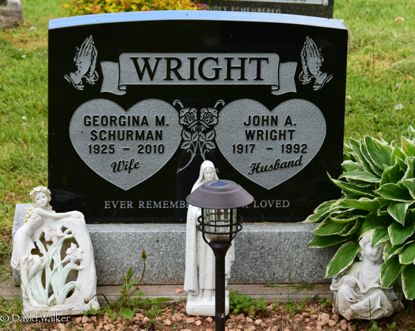 - [S12313] Cemetery marker, Peoples Cemetery, Summerside, Prince County, Prince Edward Island, Canada. John A. Wright & Georgina M. Schurman, tombstone inscription & photograph; read by David A. Walker.