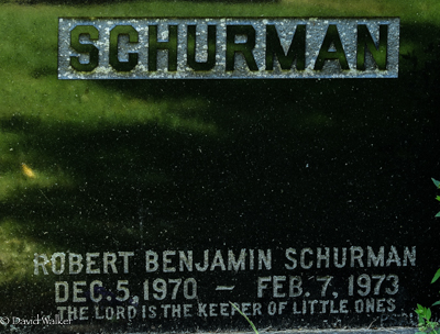 Inscription: SCHURMAN / Hon. Robert Clayton Schurman / Dec. 5, 1925 - Jan. 15, 1973 / His Wife / Lois Eleanor MacDonald / Oct. 31, 1927 - Jan. 19, 2000Back: SCHURMAN / Robert Benjamin Schurman / Dec. 5, 1970 - Feb. 7, 1973 / The Lord is the keeper of the little ones.2  Tombstone, Hon. Robert Clayton Schurman (1925-1973), his wife Lois Eleanor MacDonald (1927-2000), their grandson Robert Benjamin Schurman (1970-1973), son of Brenton Robert Schurman and Mary Carol Perry. Peoples Cemetery, Summerside, Prince County, Prince Edward Island, Canada.  Back inscription detail.