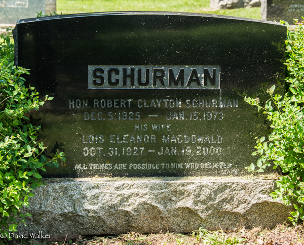 | Principal 2 | She witnessed the burial of Hon. Robert Clayton Schurman and Lois Eleanor MacDonald in the Peoples Cemetery, Summerside, Prince County, Prince Edward Island, Canada, 46.40445, -63.77567G.3 Tombstone, Hon. Robert Clayton Schurman (1925-1973), his wife Lois Eleanor MacDonald (1927-2000), their grandson Robert Benjamin Schurman (1970-1973), son of Brenton Robert Schurman and Mary Carol Perry. Peoples Cemetery, Summerside, Prince County, Prince Edward Island, Canada.  Back inscription detail. |