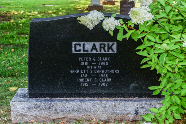 Inscription: CLARK / Peter G. Clark / 1881 - 1960 / His Wife / Harriett S. Carruthers / 1881 - 1966 / Robert C. Clark / 1915 - 1987.1,2  Cemetery marker, Peter G. Clark (1881-1960), his wife Harriett S. Carruthers (1881-1966), their son Robert C. Clark (1915-1987). Peoples Cemetery, Summerside, Prince County, Prince Edward Island, Canada.