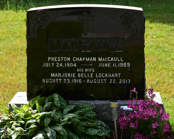 Inscription: MacCAULL / Preston Chapman MacCaull / July 24, 1904 - June 11, 1969 / His Wife / Marjorie Belle Lockhart / August 23, 1916 - August 22, 2013.1,2  Tombstone, Preston Chapman MacCaull (1904-1969), his wife Marjorie Belle Lockhart (1916-2013). St. John's Anglican Church Cemetery, Ellerslie, Prince County, Prince Edward Island, Canada.