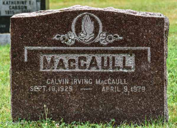 Inscription: MacCAULL / Calvin Irving MacCaull / Sept. 19, 1929 - April 9, 1979.1,2  Tombstone, Calvin Irving MacCaull (1929-1979). Presbyterian Church Cemetery, Tyne Valley, Prince County, Prince Edward Island, Canada.