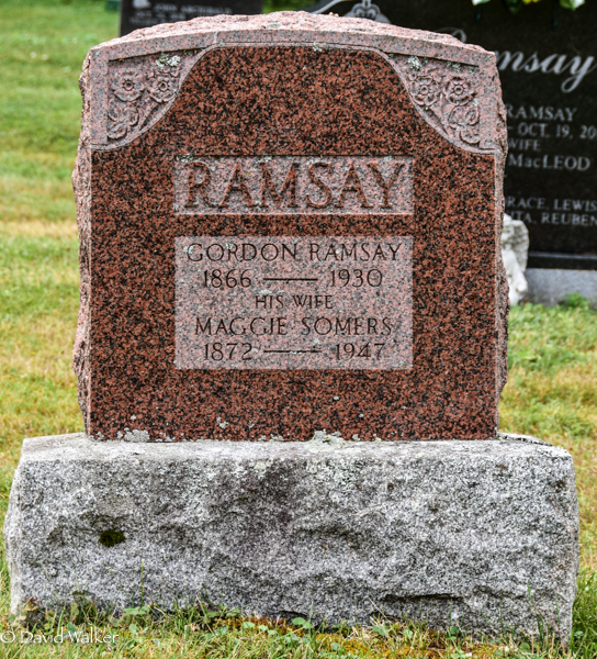 Inscription: RAMSAY / Gordon Ramsay / 1866 - 1930 / His Wife / Maggie Somers / 1872 - 1947.2,3  Tombstone, Gordon Ramsay (1870-1930), his wife Margaret "Maggie" Somers (1872-1947). Presbyterian Church Cemetery, Tyne Valley, Prince County, Prince Edward Island, Canada.