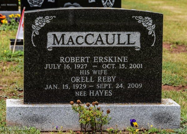 Inscription: MacCAULL / Robert Erskine / July 16, 1927 - Oct. 15, 2001 / His Wife / Orell Reby / Jan. 15, 1929 - Sept. 24, 2009 / nee Hayes.1,2  Tombstone, Robert Erskine MacCaull (1927-2001), his wife Orell Reby Hayes (1929-2009). United Church Cemetery, Bideford, Prince County, Prince Edward Island, Canada.