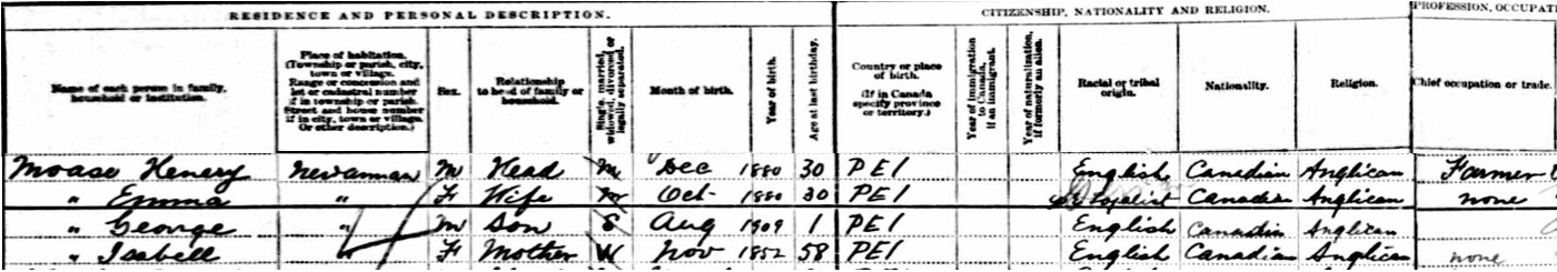 | Witness | He was enumerated on the census in 1911 in the household of John Henry Moase in Lot 19, New Annan, Prince County, Prince Edward Island, CanadaG. included in the household with Henry (age 30) were his wife Emma Schurman (age 30), their son George (age 1) and Henry's mother Isabell Burrows (age 58). Henry was a farmer. The family religion was Anglican. It's interesting to note that Emma chose to record her Racial Origin as "Loyalist", going back to her 3rd great grandfather William.3 1911 Canada Census, New Annan, Prince County, Prince Edward Island. Household of Henry Moase, his wife Emma (Schurman), their son George, Henry's mother Isabell (Burrows). |