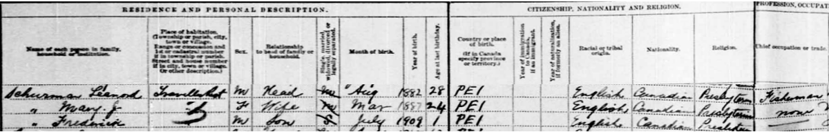 | Witness | He was enumerated on the census in 1911 in the household of Leonard Schurman in Lot 19, Travellers Rest, Prince County, Prince Edward Island, CanadaG. included in the household with Leonard (age 28) were his wife Mary (age 24) and son Frederick (age 1). Leonard was a fisherman. The family religion was Presbyterian.2 1911 Canada Census, Travellers Rest, Prince County, Prince Edward Island. Household of Leonard Schurman, his wife Mary Jane Horton, their son Frederick. |
