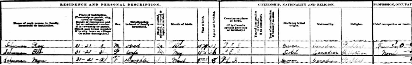 - [S8135] 1911 Canada Census, Lot 19, Prince County, Prince Edward Island, household #96 of Leonard Schurman, Microfilm, LAC Roll T-6383, page 10. District Number 30, Lot 19. National Archives of Canada, National Archives of Canada, 395 Wellington St., Ottawa, Ontario, Canada.