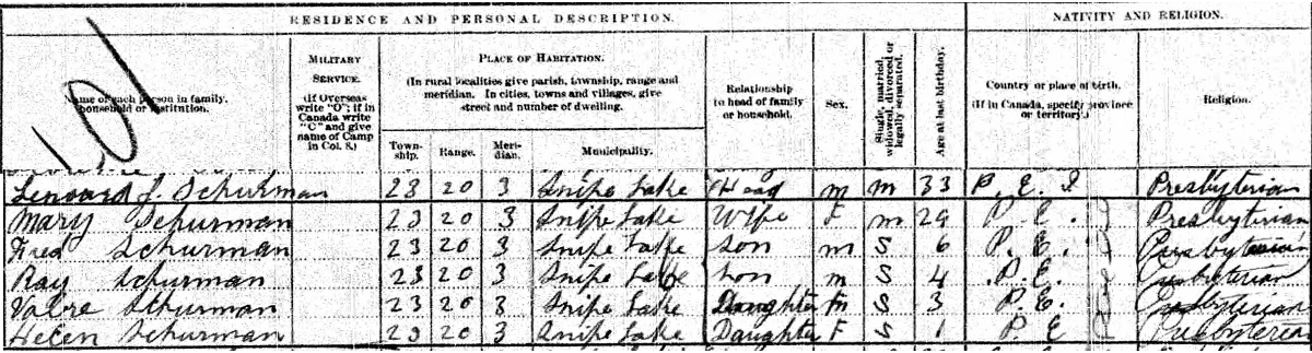 | Witness | He was enumerated on the census in 1916 in the household of Leonard Schurman in Snipe Lake, Saskatchewan, CanadaG. included in the household with Leonard (age 33) were his wife Mary (age 29), their children Fred (age 6), Ray (age 4), Valerie (age 3) and Helen (age 1). Leonard was a farm manager. The family religion was Presbyterian.1 1916 Canada Census, Snipe Lake, Saskatchewan. Household of Leonard Schurman, his wife Mary Jane Horton, their children Fred, Ray, Valerie and Helen. |