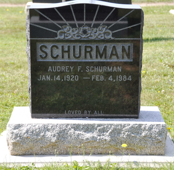 Inscription: SCHURMAN / Audrey F. Schurman / Jan. 14, 1920 - Feb. 4, 1984Back: SCHURMAN.4,2  Tombstone, Audrey F. (Tuplin) Schurman (1920-1984). Peoples Cemetery, Kensington, Prince County, Prince Edward Island, Canada.